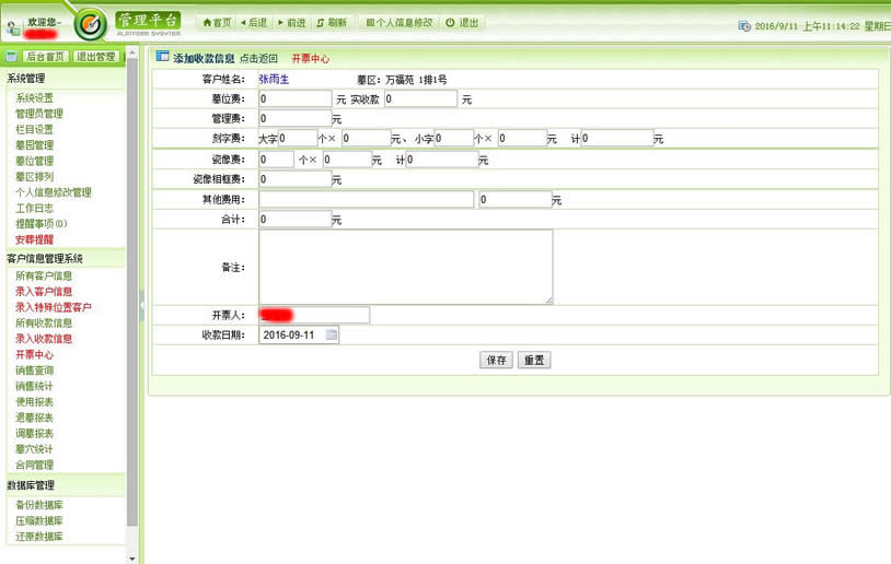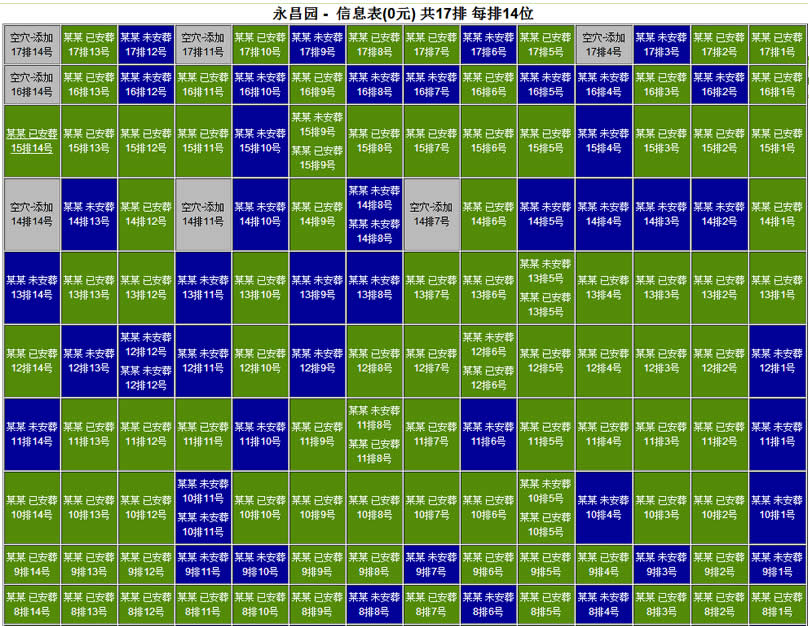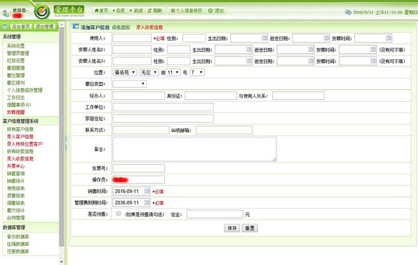 4、系統(tǒng)中從選擇墓穴到安葬有多種可操作的方式供選擇,可登記不繳費(fèi)不安葬、登記不繳費(fèi)且安葬、登記交押金不安葬、登記交押金且安葬、登記交費(fèi)不安葬、登記交費(fèi)且安葬,根據(jù)不同的辦理情況墓穴也會出現(xiàn)不同的占用狀態(tài)。
